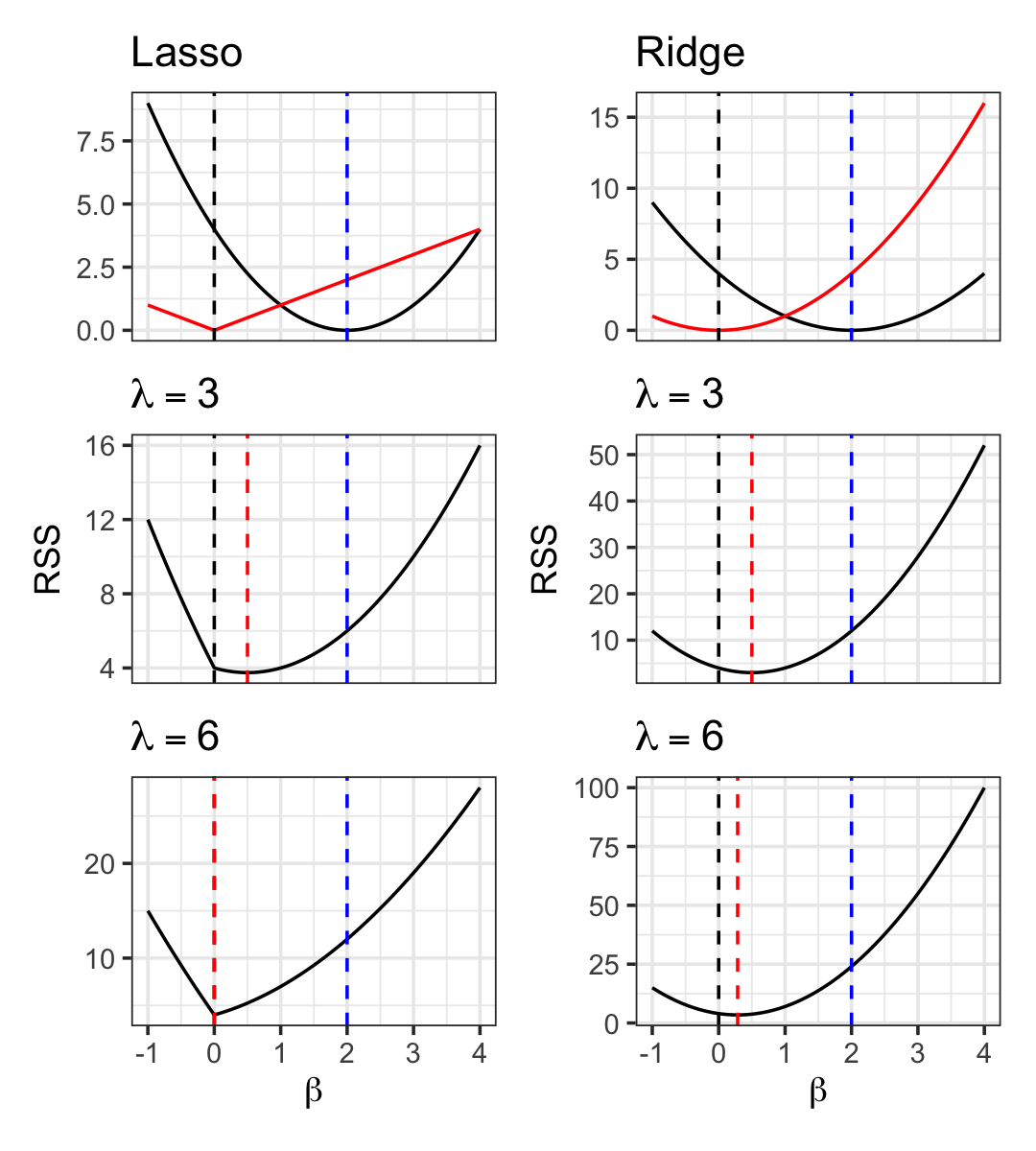 Let’s suppose that \(\hat \beta=2\), and let’s consider what happens when we add \(L^1\) and \(L^2\) penalties, as shown in Figure 19.8.