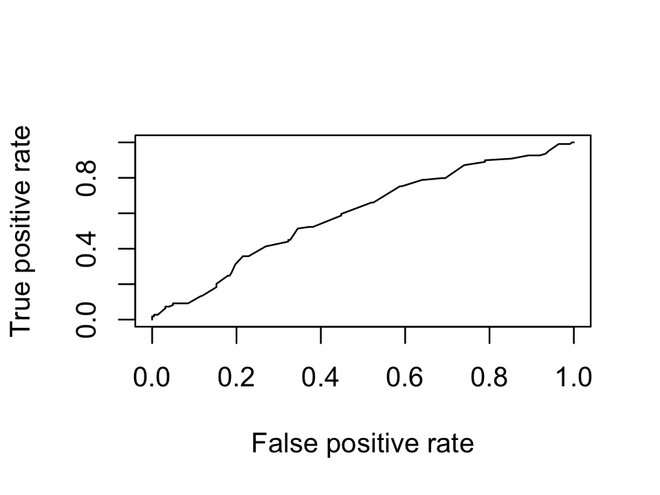 Example 17.3 (Pima ROC curve) Continuing from Example 17.2, we can produce an ROC curve for our logistic regression model. There are many packages to compute ROC curves, but here we will use ROCR, which can plot many different performance measures.