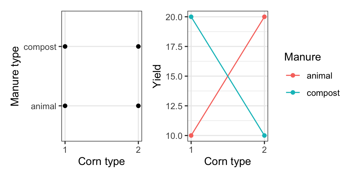 The problem is illustrated in Figure 7.1, which shows the design space—the space of possible combinations of treatment factors—and the yield for (hypothetical) combinations of corn type and manure type. A one-factor-at-a-time experiment only explores one “slice” of the design space at a time. If we start with corn type 1, for example, we conclude that compost is better than animal manure. If we then do a new experiment to compare corn types 1 and 2, using compost, we’ll find corn type 2 has much worse yield, even though it would perform just as well with the right animal manure.